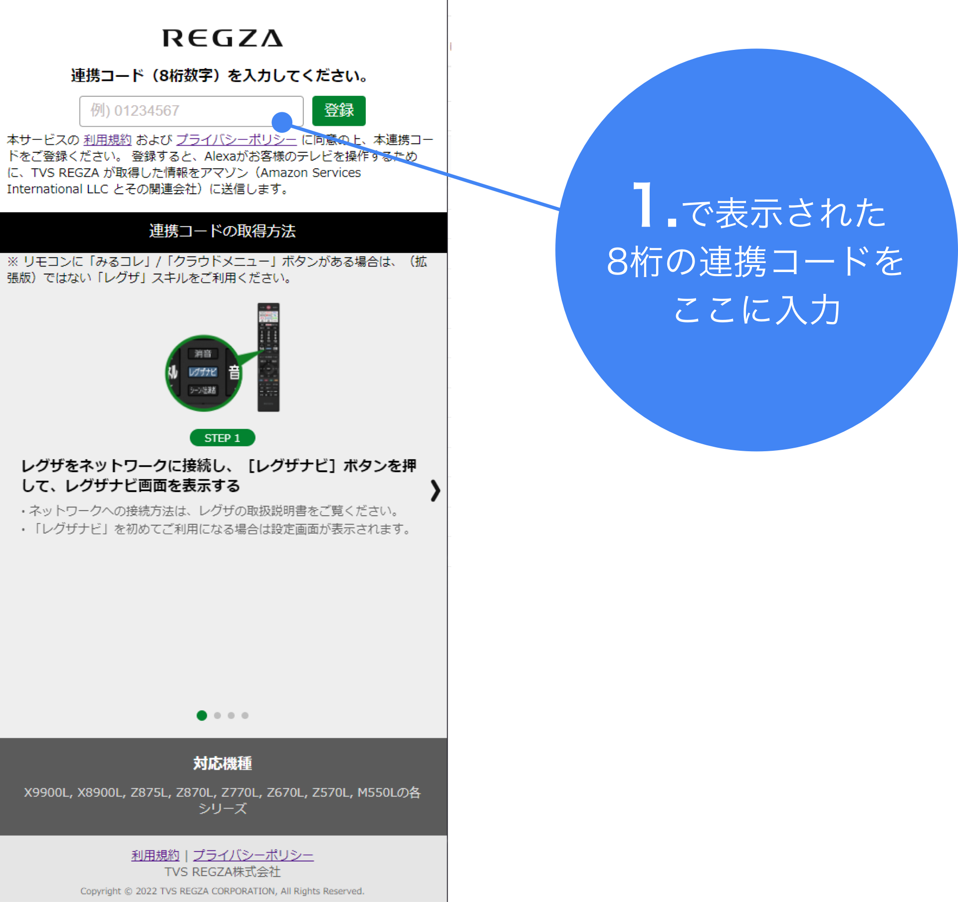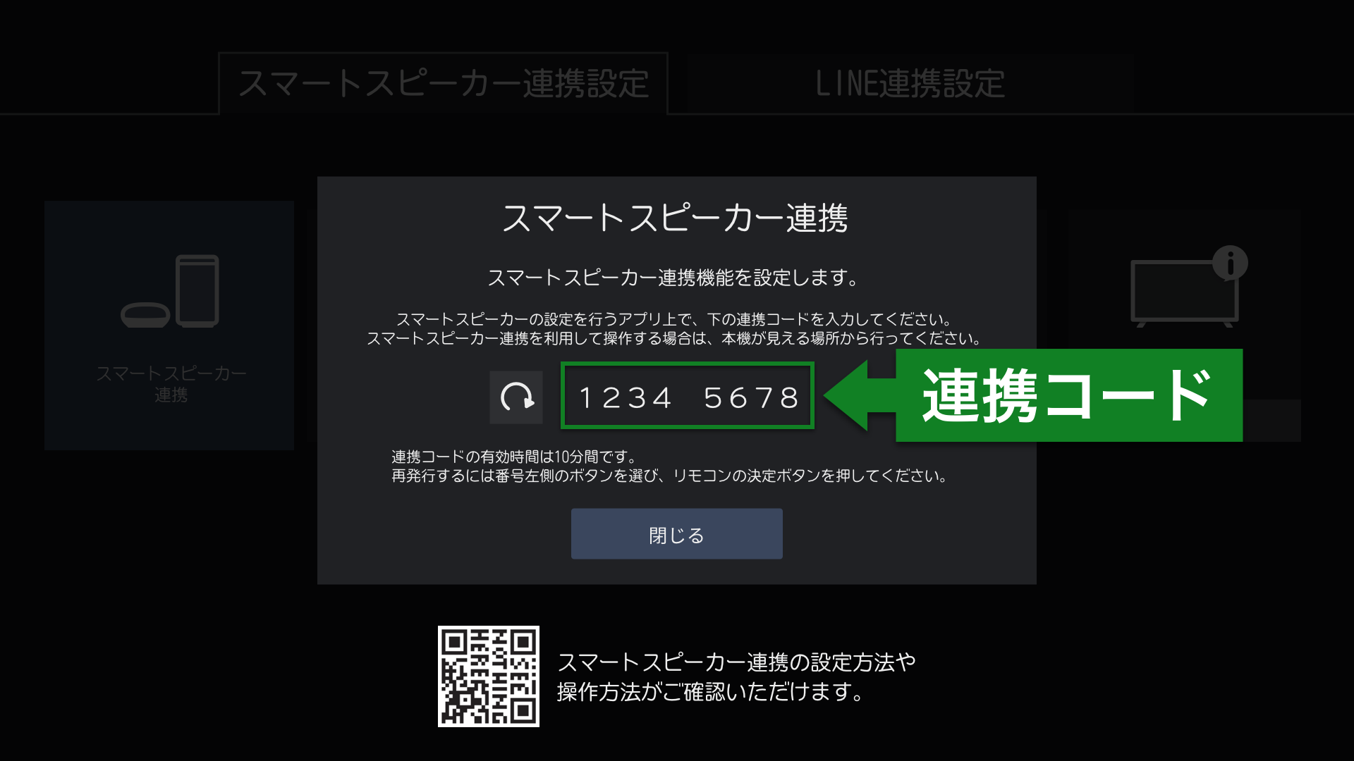 • 連携コードの有効時間は10分間です。有効期限が切れた場合は、レグザの連携コード表示横にあるボタンを押して再発行してください。