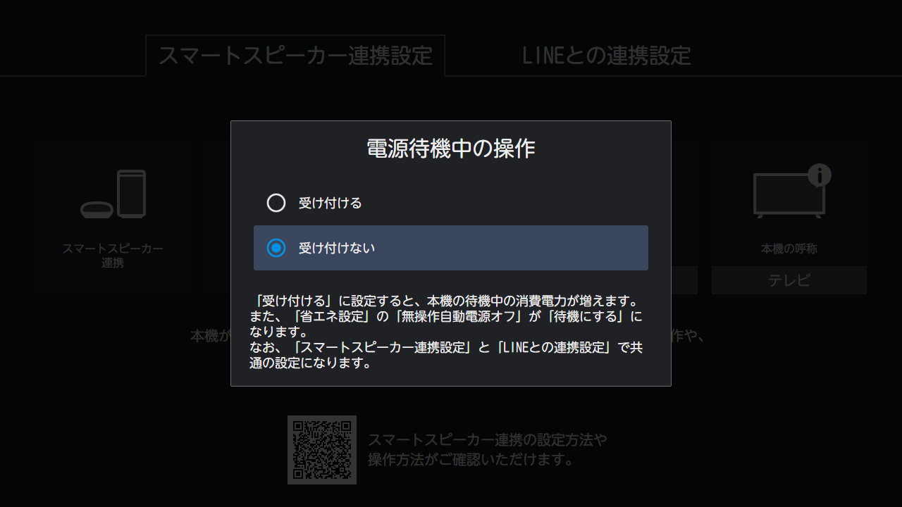「電源待機中の操作」が表示されます。 「受け付ける」を選択すると、本機が電源待機状態(リモコンで電源オフした状態)でもスマートスピーカーから操作できるようになります (本機の待機中の消費電力が増えます。「省エネ設定」の「無操作自動電源オフ」が「待機する」になります)。 「受け付けない」を選択すると、本機が電源待機状態(リモコンで電源オフした状態)ではスマートスピーカーからの操作はできません。